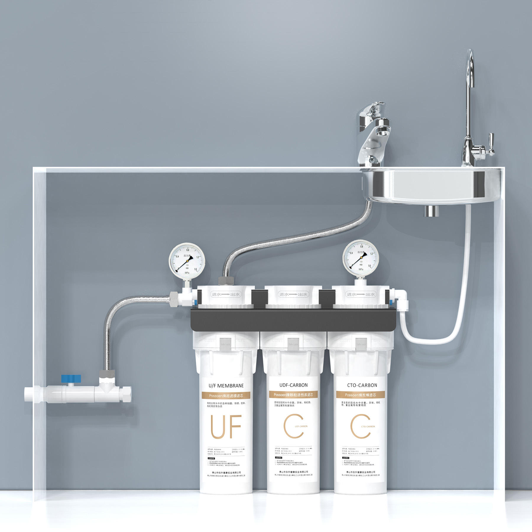 Three-Stage Filter Housing With Flush Function[for 10-inch Cartridge]